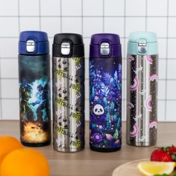 Deze geweldige thermofles is dankzij de intuïtieve opening en het praktische siliconen tuitje gemakkelijk te gebruiken voor kinderen vanaf jonge schoolleeftijd. De inhoud is 450 ml en de fles is verkrijgbaar in verschillende speelse designs die afgestemd kunnen worden op andere schoolbenodigdheden.