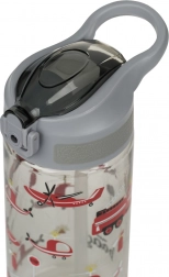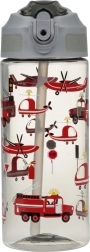 Transparante kunststof fles met afbeeldingen van rode brandweerwagens en helikopters, ideaal voor plezier bij elke slok.
