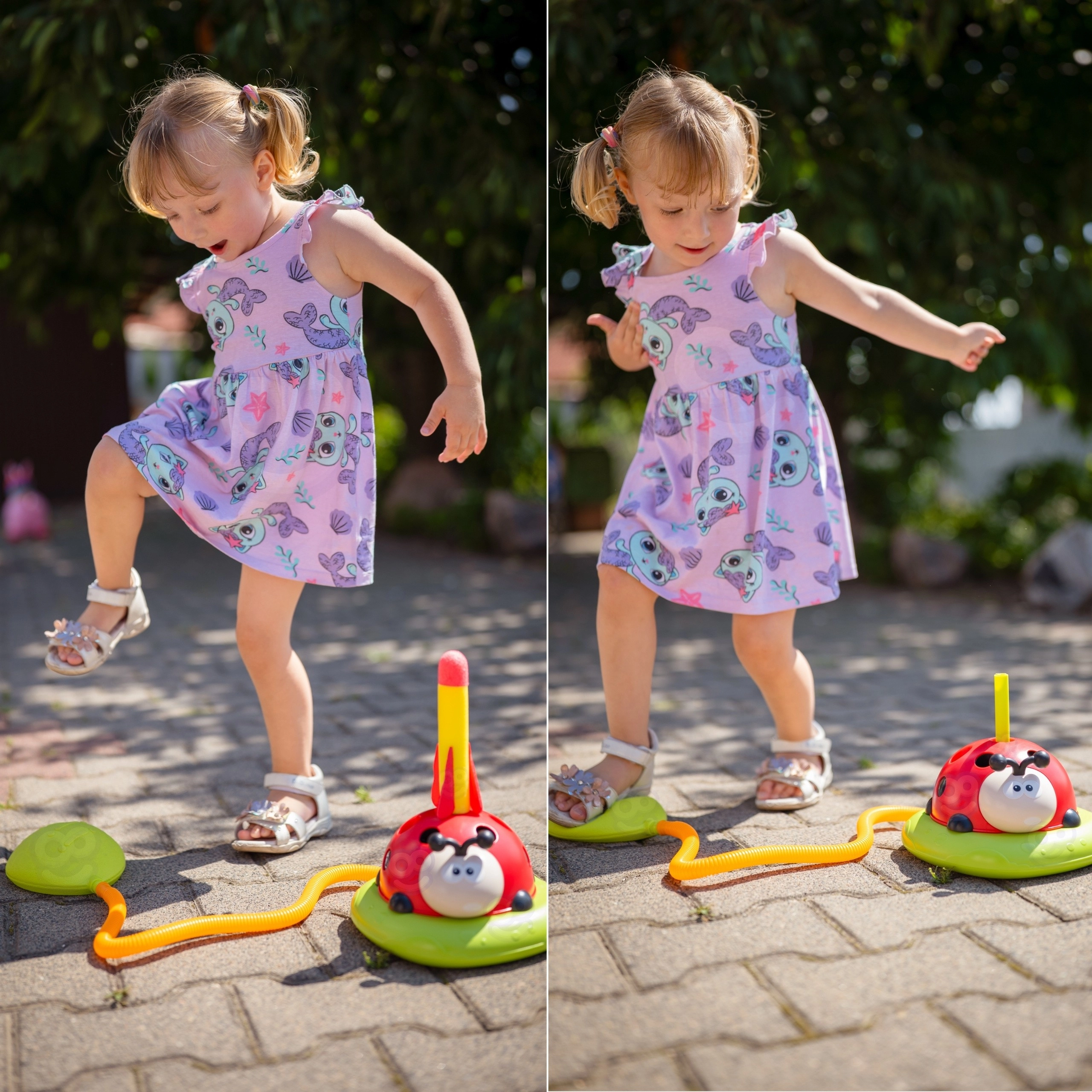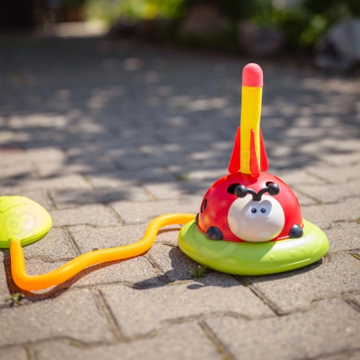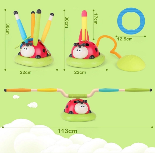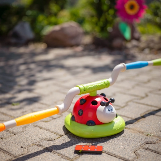 Met deze kleurrijke “lieveheersbees” oefenen kinderen hun behendigheid en beleven ze veel beweging. 3 activiteiten in 1 betekenen het einde van verveling: over een draaiende stang springen, een zachte raket afschieten door op de pomp te stappen en ringen op doelen werpen. Het spel is geschikt vanaf 3 jaar, is duurzaam en veilig en motiveert tot actief spelen in de tuin, op de speelplaats en in de woonkamer.
