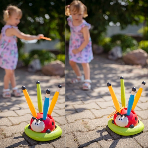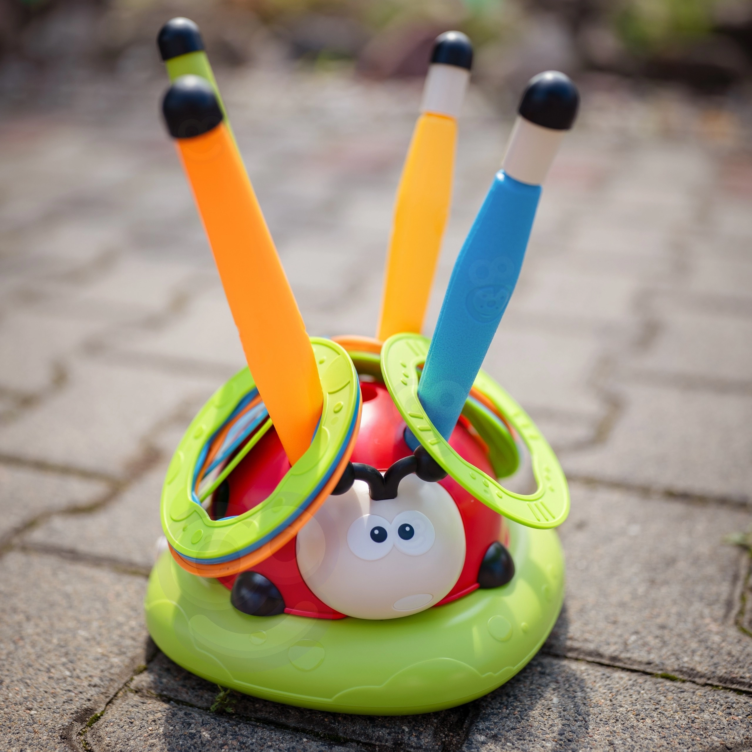 Kleurige ringen mikken op de pinnetjes in de lieveheersbees-basis. Actief spel ontwikkelt fijne motoriek, geduld en competitiegevoel.