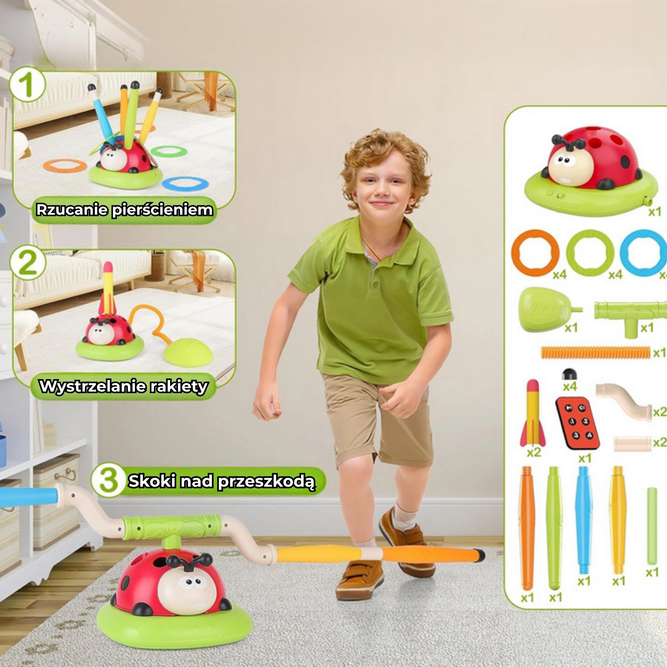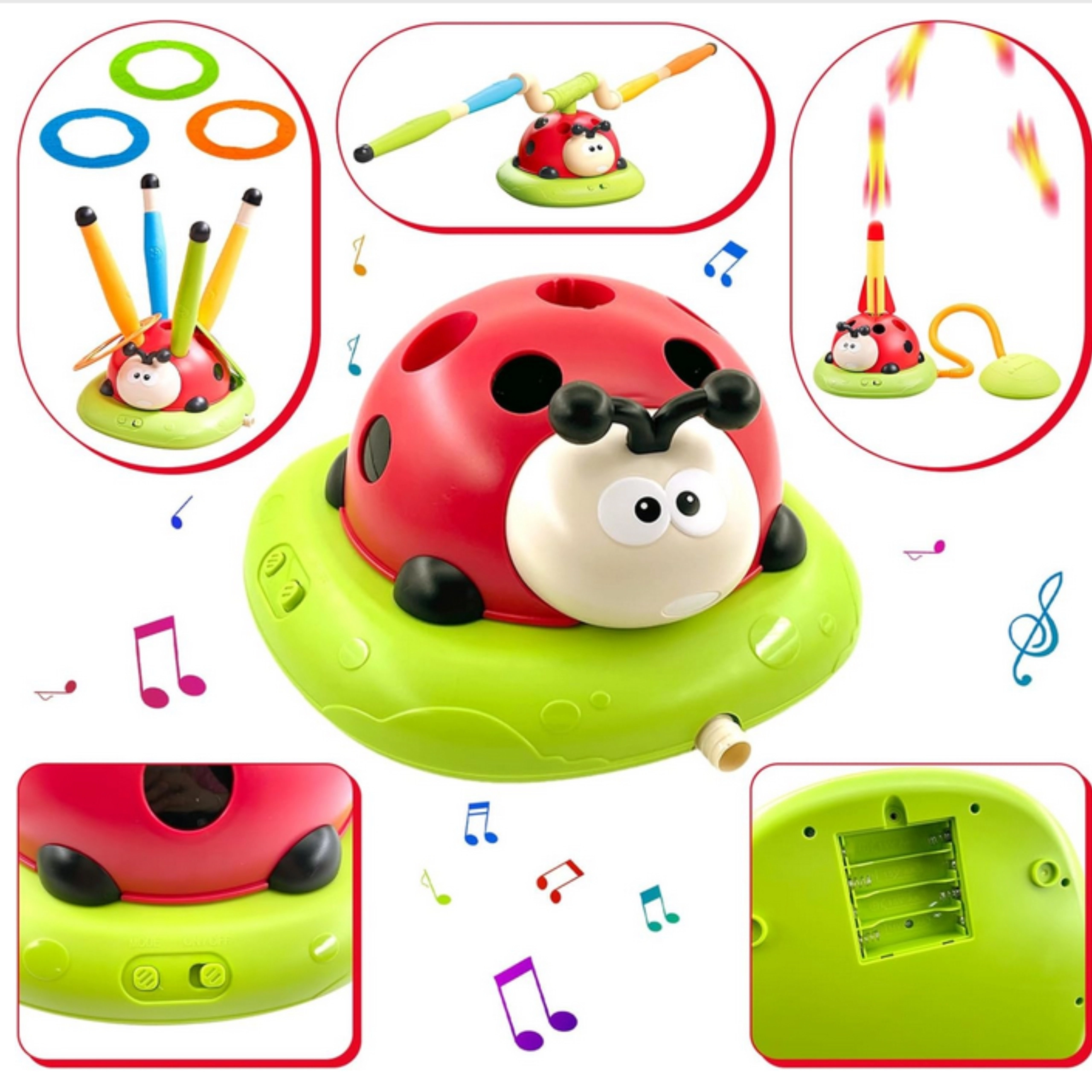 Ideaal voor feestjes, picknicks en familie-middagen. Voeding van de interactieve functies: 4× AA (niet inbegrepen). In de doos: de lieveheersbees, 12 gekleurde ringen, raket met pomp, onderdelen van de springstang en een afstandsbediening.