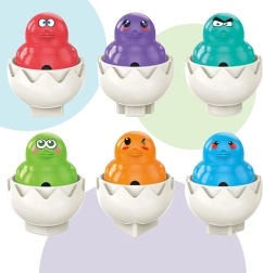 Speeleieren van het merk Woopie introduceren je kind in een wereld vol kleuren, vormen en vrolijke gezichten. Elk van de zes schattige eieren verbergt een gekleurd kuikentje met een grappige uitdrukking en geeft bij het indrukken een geluidseffect. Het doel is niet alleen om de juiste schaal bij elkaar te passen, maar ook om deze op de juiste plek in de houder te plaatsen.