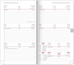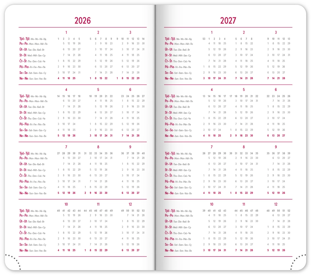- Wekelijks schema met een Tsjechisch-Slowaakse kalender, aangevuld met Engels, Duits, Hongaars en Russisch voor maximaal gebruik.
