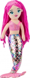 De pluche zeemeermin is uitgerust met een opvallende holografische staart die op schubben lijkt en prachtig glinstert in het licht, verwijzend naar de magische onderwaterwereld. Ze heeft ook lange roze haren in de vorm van gevlochten strengen die je kunt aaien en stylen, een glinsterend topje over één schouder en een roze tiara op haar hoofd.