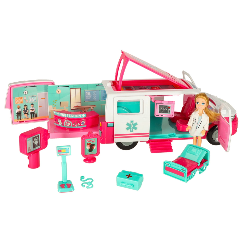 Mobiele ambulance voor kinderen met arts en accessoires, stimuleert creativiteit en rollenspel als hulpverlener.
