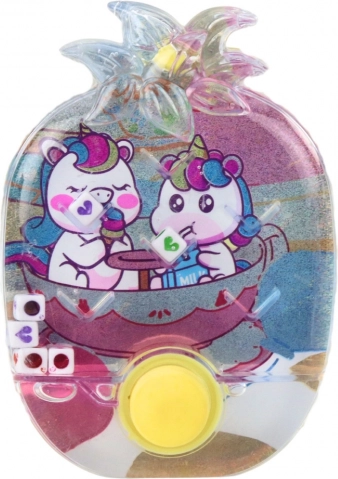 Dit waterspel met een betoverend eenhoornmotief is een klassieke speelgoedhit die al vele jaren kinderen van verschillende leeftijden blij maakt. Dankzij het compacte formaat en het eenvoudige mechanisme is het ideaal voor onderweg, naar school of tijdens een wandeling. Het spel bestaat uit het indrukken van een knop, die de kleurrijke ringetjes of balletjes in de met vloeistof gevulde transparante behuizing in beweging brengt. Het doel is om deze elementen op pinnetjes of in de daarvoor bestemde vakjes te plaatsen.