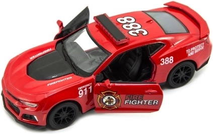De brandweer-Camaro valt op door de metalen afwerking, te openen details en opvallende dienstmarkeringen voor een lange levensduur en een aantrekkelijk uiterlijk.