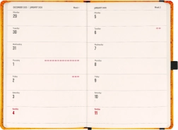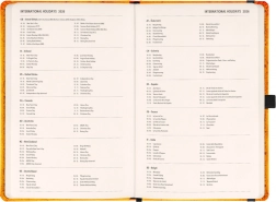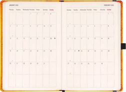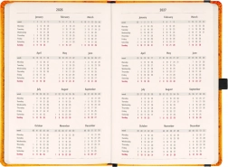 De eerste helft bevat een veertiendaags horizontaal kalendarium met internationale feestdagen.