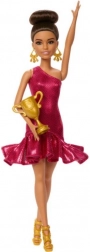 Gekleed in een glinsterende, rode one-shoulderjurk die perfect past bij haar gouden oorbellen en hoge hakken, is Barbie klaar voor haar grote overwinning.