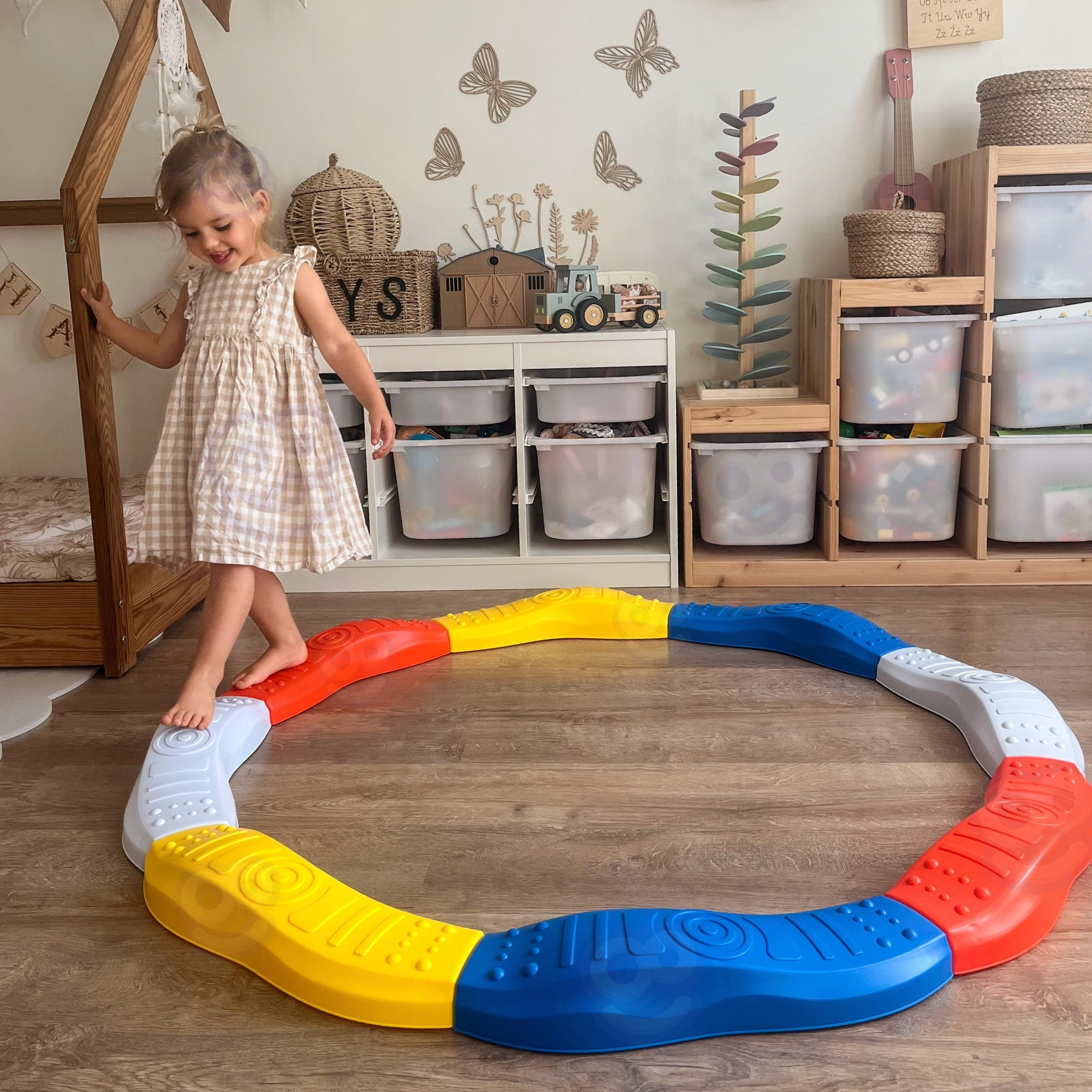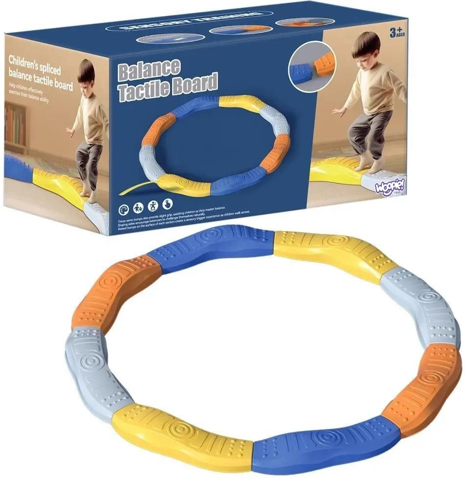 Breng kinderen in beweging en laat ze plezier maken met de modulaire sensorische evenwichtsbaan in cirkelvorm van het merk Woopie. Verbindbare gebogen segmenten met een antislipoppervlak stimuleren de balans, coördinatie en zintuiglijke waarneming van de voeten. Van 8 delen maak je eenvoudig een cirkel, golf of eigen vormen – ideaal voor thuisoefeningen en spel op elk vlak oppervlak.