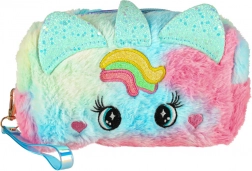 Ontwerp geïnspireerd op een eenhoorn met regenboogpatroon en oortjes, ideaal voor het opbergen van cosmetische benodigdheden.