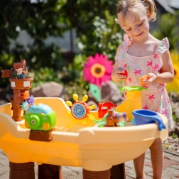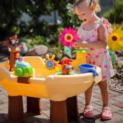 De Woopie water- en zandtafel in de vorm van een piratenschip tovert de achtertuin om tot een avontuurlijke baai. Kinderen kunnen water spuiten met het kanon, het langs de glijbaan laten stromen, kleine en grote waterwielen laten draaien en zeepbellen blazen. Dankzij de stabiele poten en hoogwaardige kunststof is de tafel duurzaam, veilig en geschikt voor dagelijks gebruik.