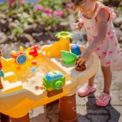 De geïntegreerde zeepbellenmaker en het waterkanon veranderen spelen in een piratenshow. Kinderen kunnen spuiten, blazen en zowel de bellen als stromend water bewonderen.