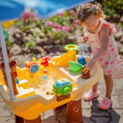De toren met piraat, het roer, de anker en de waterglijbaan creëren een authentieke piratenwereld. Kinderen gieten water in trechters, laten wielen draaien en zetten waterbanen in beweging.