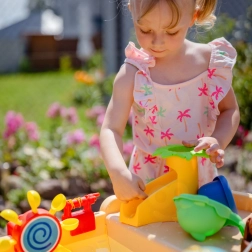 De grote Woopie watertafel in piratenschip-design verandert de tuin in een baai vol ontdekkingen. Kinderen kunnen water gieten, waterwielen laten draaien, met het kanon spuiten, bellen maken en het schip besturen met de piratentoren en het roer. De geïntegreerde zonneparasol biedt schaduw op warme dagen, zodat spelen comfortabel en veilig is.