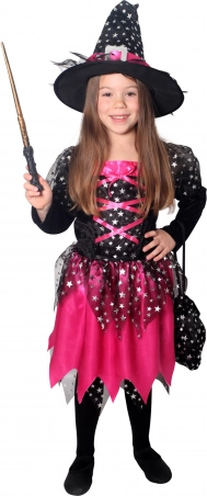 Magisch kostuum voor kleine heksjes! Dit zwart-roze kostuum is ideaal voor meisjes van 4 tot 6 jaar, versierd met roze linten en zilveren sterren.