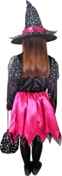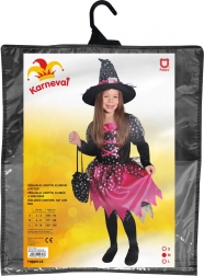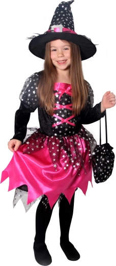 Magisch carnavalskostuum voor kleine heksjes! Het zwart-roze kostuum is ideaal voor meisjes van 6-8 jaar, lengte 117-128 cm. Het valt op door roze linten en zilveren sterretjes.