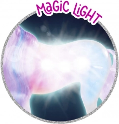 Ontdek de fantasiewereld met de pop Steffi, die is gekleed in betoverende prinsessenjurken, ideaal voor elk sprookje. Haar trouwe metgezel, de eenhoorn, ziet er niet alleen spectaculair uit dankzij zijn gloeiende functie, maar maakt ook het creëren van verschillende kapsels mogelijk dankzij zijn lange manen.