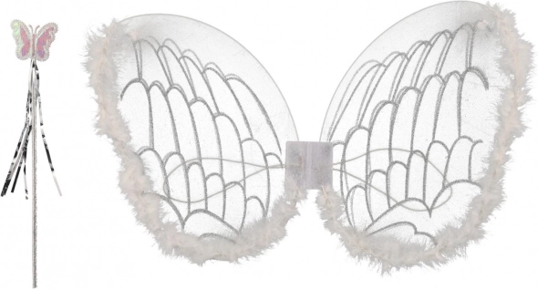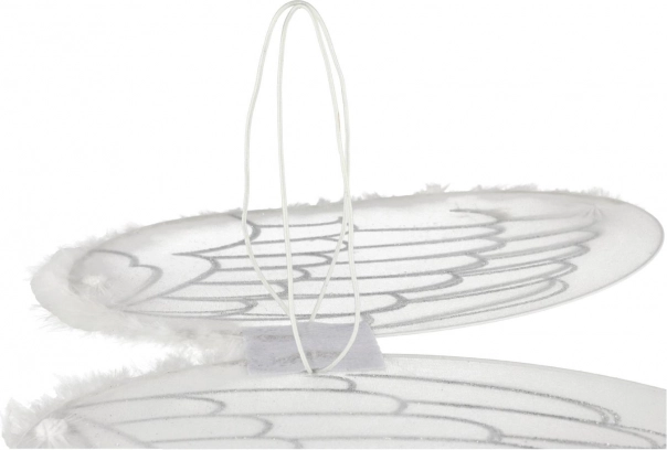 Witte vleugels met een verenrand en zilverkleurige nerven zijn visueel opvallend en toch prettig te dragen dankzij de elastische schouderbandjes.