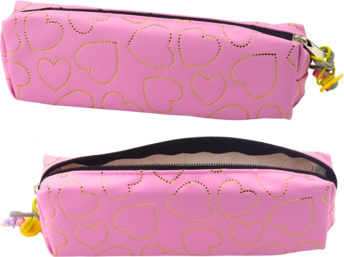 Stijlvolle roze etui met gouden hartjes is een ideale accessoire voor school, universiteit of kantoor. Dankzij het unieke design en het praktische formaat past alle benodigde schrijfwaren erin en hij past gemakkelijk in een rugzak of handtas.