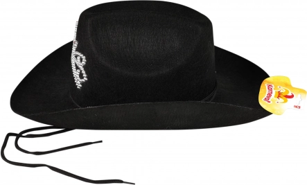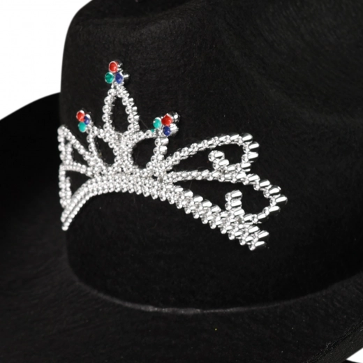 De zwarte cowboyhoed is versierd met een zilveren kroon, ideaal voor elke leeftijdsgroep. Een stijlvol accessoire waarmee je onweerstaanbaar opvalt.