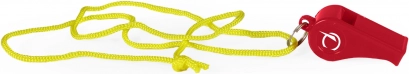 Rood plastic fluitje bevestigd aan een gele koord, ideaal voor signalering of sportieve activiteiten.