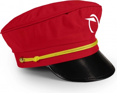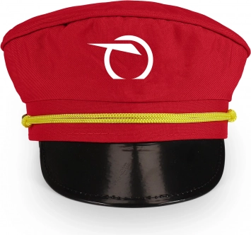 Stijlvolle rode pet met het logo van de Železničná spoločnosť Slovensko, een glanzende zwarte klep en een gele koord. Ideaal om te spelen als dispatcher.