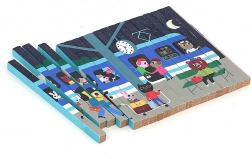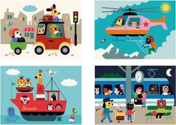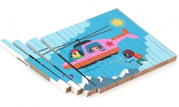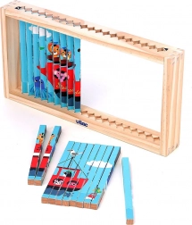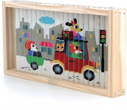 Ontdek de wereld vanuit verschillende hoeken met deze vierdimensionale houten puzzel. Dankzij het design van Ingela P. Arrhenius wachten je vier verschillende illustraties: auto, boot, helikopter en trein. Door de houten staafjes in de standaard te schuiven, verkent het kind niet alleen verborgen afbeeldingen, maar ontwikkelt het ook logisch denken en observatievaardigheden.
