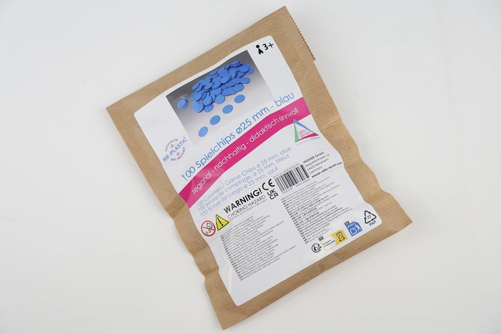 De chips zijn gemaakt in Duitsland en verpakt in een hersluitbaar papieren zakje met FSC-certificering, wat een verantwoorde benadering van de natuur garandeert. Met een diameter van 2,5 cm zijn ze ook voor kleine kinderen gemakkelijk vast te pakken.