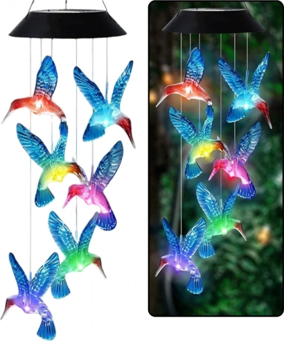 De zonne-windgongen in de vorm van kolibries zijn een unieke decoratie die elegantie en functionaliteit combineert. Met energie van het zonnepaneel is dit product milieuvriendelijk en heeft het geen extra stroombron nodig. Dankzij de ingebouwde schemersensor schakelt de verlichting automatisch in bij het invallen van de duisternis.