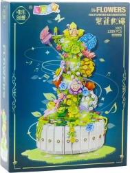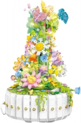 Een uitstekende bouwset die kleurrijke flora combineert met een stijlvol decoratief element, met gedetailleerde structuren van bloemen, bladeren en vlinders. De samengestelde compositie rijst spiraalsgewijs op en eindigt in een prachtig toppunt. De basis van het model is rond, wit en heeft een decoratief ontwerp.