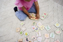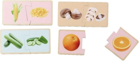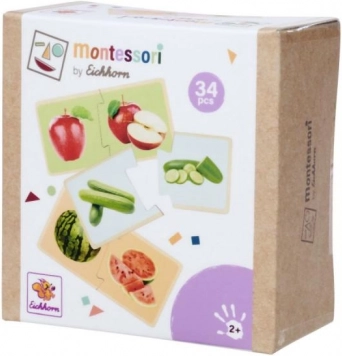 De houten Montessori-puzzels met het thema fruit en groenten leren kinderen identieke stukjes correct te koppelen en de verschillende voedingsmiddelen te benoemen. Realistische illustraties helpen het spel te verbinden met het dagelijks leven en ondersteunen natuurlijk leren door te spelen.