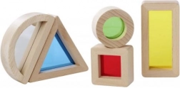 Blokken in verschillende vormen nodigen uit om te experimenteren met licht, kleuren en vormen. Kinderen kunnen de wereld door gekleurde lenzen bekijken, kleuren mengen of zichzelf ontdekken in het spiegeleffect. De zorgvuldige afwerking van stevig beukenhout zorgt voor een aangenaam gevoel en een lange levensduur.