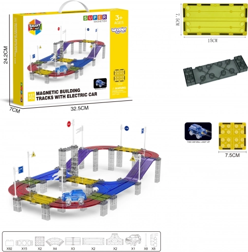 Ontdek de creatieve wereld van de WOOPIE bouwracebaan, die fantasie, creativiteit en logisch denken stimuleert. Magnetische onderdelen klikken snel en stevig aan elkaar, zodat kinderen vanaf 3 jaar zonder gereedschap kunnen monteren. Gekleurde transparante elementen in combinatie met het LED-autootje creëren een boeiende lichtshow.