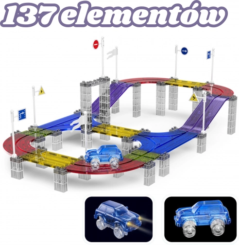 De magnetische racebaan van WOOPIE verandert spelen in een geweldig avontuur vol licht en kleur. Dankzij de eenvoudig te koppelen magnetische onderdelen bouwen kinderen zelfstandig verschillende meerlaagse banen, waarover een lichtgevend LED-autootje rijdt. Transparante, kleurrijke elementen zorgen voor veel plezier overdag en ’s avonds.