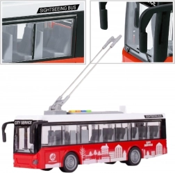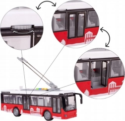 Deze gedetailleerde trolleybus op schaal 1:16 biedt kinderen een authentieke ervaring van stadsvervoer. Dankzij vier knoppen op het dak genieten ze van realistische rijgeluiden, signalen en omroepberichten, terwijl de interne verlichting de sfeer van een echt voertuig benadrukt. De frictie-aandrijving zorgt ervoor dat hij na een lichte duw enkele meters rechtuit rijdt.