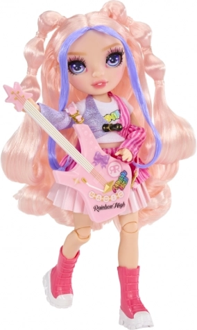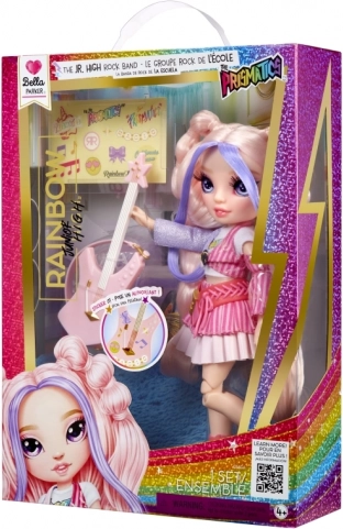 Rainbow High Junior Bella met basgitaar. Roze stijl, poseerbare gewrichten, accessoires en stickers. Geweldige pop voor creatief spel vanaf 4 jaar.