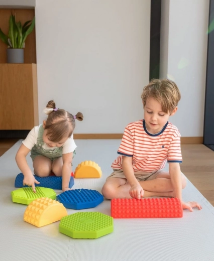 Maak thuis of in de kleuterklas een leuk sensorisch parcours voor kinderen! Deze balanceerset met 8 delen in vrolijke kleuren ondersteunt balans, coördinatie en fijne en grove motoriek. De onderdelen met antisliptextuur bieden rijke tactiele stimulatie en dankzij de draagkracht tot 100 kg zijn ze geschikt voor zowel kinderen als volwassenen, voor training of therapie.