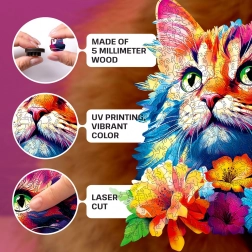 Deze premium houten puzzel met kattenmotief combineert hoogwaardig vakmanschap met een milieubewuste aanpak. Dankzij het 5 mm hout is hij stabiel en prettig om aan te raken, lasersnijden zorgt voor gladde randen en perfecte passing van de stukjes. Moderne UV-print levert rijke kleuren en een gedetailleerd beeld dat ook uitblinkt als wanddecoratie.