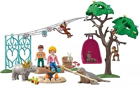 Het kleine neushoorntje is jarig en iedereen is uitgenodigd! De zeehond bereidt heerlijke geroosterde appels boven het vuur, het konijntje neemt een pauze na vrolijke spelletjes en de gasten verzamelen zich onder de slinger die in het donker licht. De PLAYMOBIL-set biedt tal van mogelijkheden voor creatief spel, zowel overdag als ’s nachts.