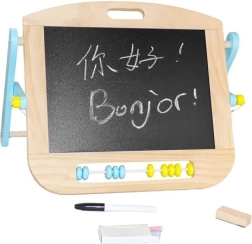 Het multifunctionele bureaubord is een geweldige hulp voor de eerste teken-, schrijf- en leeractiviteiten. Dankzij de twee oppervlakken schakelen kinderen gemakkelijk tussen tekenen met stift en met krijt, trainen ze de fijne motoriek en stimuleren ze hun fantasie. Het geïntegreerde tweekleurige telraam ondersteunt vroege rekenvaardigheden.