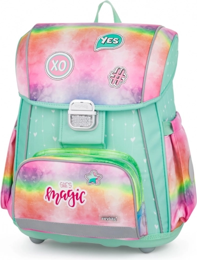 Dankzij één ruime hoofdvak past alle schoolmateriaal voor groep 3–4 gemakkelijk in de tas. Het voorvakje is ideaal voor lunch en kleine spullen. De veiligheid wordt verhoogd door een metalen sluiting met reflecterende reflector en meerdere andere reflecterende elementen die de zichtbaarheid van het kind verbeteren bij schemering en beperkt zicht.