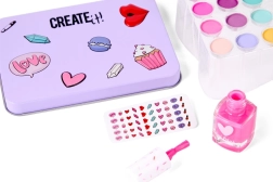 Deze kindercosmeticaset biedt een veilige en leuke introductie in de wereld van make-up. Dankzij de verschillende kleuren oogschaduw en nagellak kunnen kinderen eindeloos veel kleurcombinaties maken en hun esthetisch gevoel ontwikkelen. De blikken doos beschermt de inhoud en dient tegelijk als een praktische en stijlvolle opbergbox.