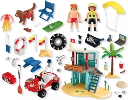 Deze gedetailleerde set bevat een reddingstoren met twee verdiepingen met een snelle glijstang, een volledig uitgerust redderspost en beneden een serviceruimte met gereedschap. De set omvat ook een strandbuggy voor acties verder van de toren, een reddingsboard en een trouwe reddingshond met vest.