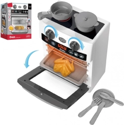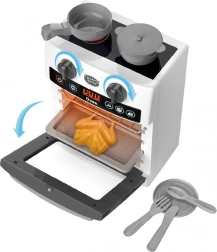 Ontdek het leuke kinderkeukentje met oven dat licht geeft en realistische geluiden maakt zoals echte apparaten. Druk gewoon op de ON-knop, kies een van de drie modi en het spel kan beginnen – de oven gaat branden en de keuken speelt authentieke geluideffecten af. Twee branders en twee draaiknoppen met klik versterken het gevoel van echt koken. Inclusief rijk accessoirespakket voor het bereiden van “heerlijke” gerechten.