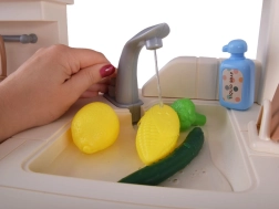 De keuken stimuleert de ontwikkeling van creativiteit, fijne motoriek en samenwerking. Kinderen kunnen hun eigen sandwiches, stokbroden en hamburgers samenstellen met meerlaagse onderdelen, een “menu” plannen en kennismaken met gezonde voeding.