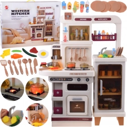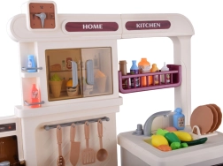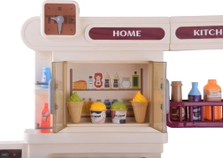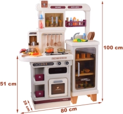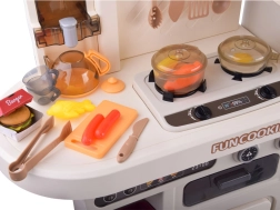 Grote kunststof kinderkeuken in zachte beige tinten die elke kinderkamer in een culinair studio verandert. Biedt licht- en geluidseffecten, een realistisch stomende kookplaat, openslaande ovendeur en kastjes, een werkende pompkraan en rijk accessoires voor fantastisch koksspel.