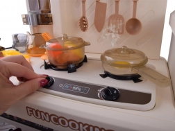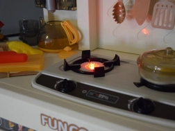 De interactieve brander biedt twee modi: kookgeluid met licht of stoomeffect met geluid. Draaiknoppen en bedieningspaneel geven het spel een realistische touch.