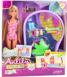 Ontdek de magie van zomers spelen met de pop ANLILY in badpak, een zwembad met glijbaan en een palm. De uitgebreide set met accessoires (sandalen, drankjes, ijsjes) stimuleert creatief spel, prikkelt de fantasie en zorgt voor uren speelplezier.