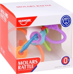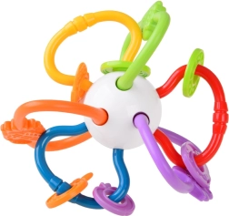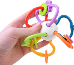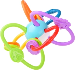 Deze bijtring is gemaakt van hoogwaardige, veilige materialen die geschikt zijn voor baby’s. Dankzij de flexibele, gedraaide delen is hij gemakkelijk vast te pakken, masseert hij het tandvlees en rammelt hij zachtjes, wat het gehoor stimuleert. Soepel verschuifbare kleurrijke elementen nodigen uit tot ontdekken en trainen de fijne motoriek.